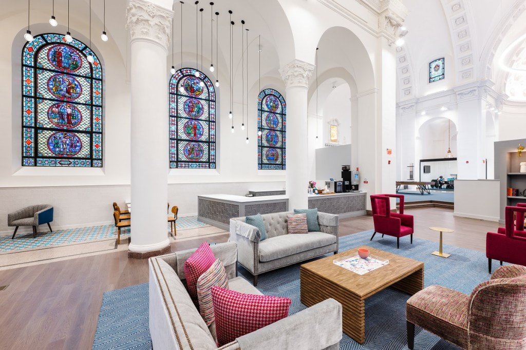 At the heart of the 11.6-acre site, Maker Hall—housed in the former church—is the main amenities center for the community. The existing structure had been abandoned for over a decade, requiring a meticulous construction process with significant attention to detail to restore the original features, including the 55-foot ornate ceilings with unique plaster moldings to the towering stained-glass windows.