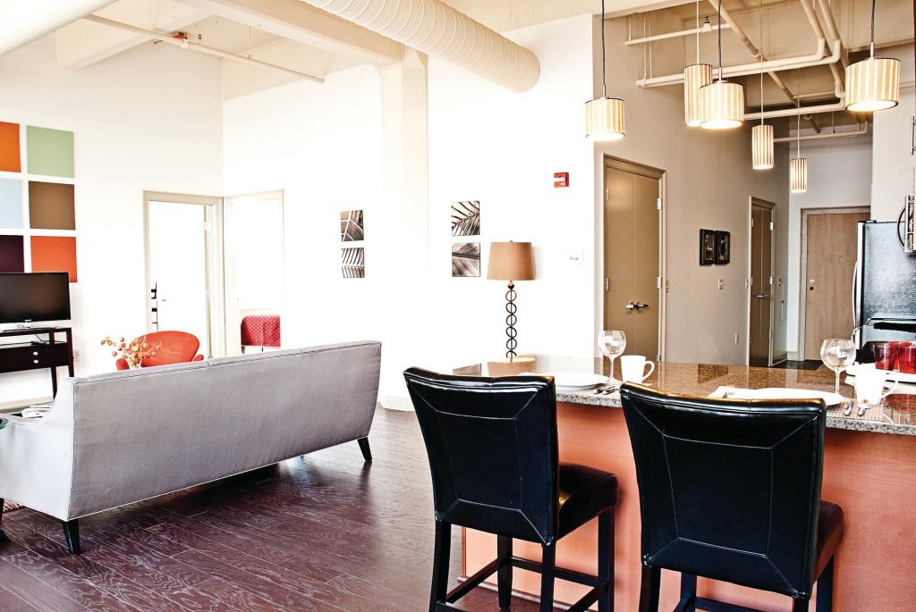 After purchasing the almost-40,000-square-foot building for $600,000 in March 2010, Baynes brought in Kent Frey, president of Frey Electric Construction Co., who contributed another $600,000. With input from architect Steven Carmina, managing partner at locally based Carmina Wood Morris, the team decided its best use would be as loft-style apartments and ground-floor commercial space. They renamed it “100 South” to reflect the project’s location at 100 South Elmwood Ave.