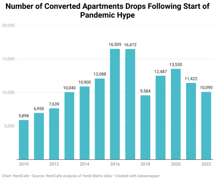 In 2022, the report finds that only 10,090 apartments were retrofitted, decreasing 12% from 2021 and 25% from 2020. Los Angeles; Kissimmee, Florida; and Alexandria, Virginia, led the way for conversions, making up 20% of the nation’s total. Other hot spots for conversions last year include Baltimore and Midwest cities, such as St. Louis, Cleveland, Kansas City, and Minneapolis.