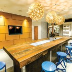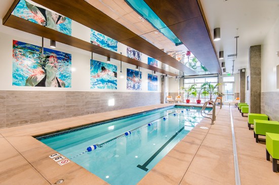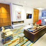 Though Fefercorn expected a mix of demographics, he projected the majority of Track 29’s tenants would be young professional women seeking an active yet quiet, nonparty ambience. To appeal to them, he added a long list of amenities, including a gym, a Zen garden with waterfall, a tea bar, and an art gallery. The space also includes safe indoor parking, bicycle storage, and outside bike racks fashioned from railroad tracks. Pops of color in a light palette differentiate the floors.