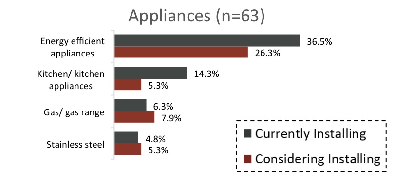 For appliances, 63 of the 159 total respondents said they’re installing appliances with newer technologies. Of those, 36.5% reported installing energy-efficient appliances, while 26.3% said they’re considering adding this amenity.