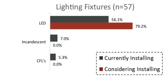 For lighting fixtures, 57 respondents reported using lighting fixtures with newer technologies. Of those, 56.1% said they’re installing LED lights, which last longer and use less energy than conventional bulbs, and 79.2% are mulling LED improvements.