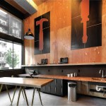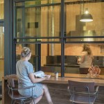 The utility kitchen offers more space for cooking projects. The industrial-style kitchen has a glass cooktop, a large hooded vent, and a window that opens into the lobby with a seating table beneath to encourage interaction between tenants. The space provides opportunities for a number of food-related ventures, like canning, home brewing, or even putting on a cooking show.