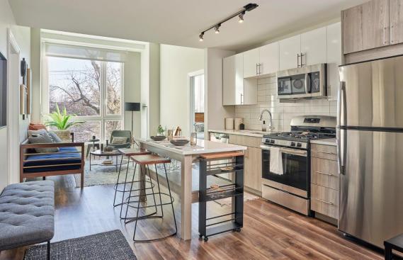 “High‐end finishes and fixtures are standard in our apartments. Details matter, and residents notice the difference,” explains Kitson. “The overall apartment design presents a clean, modern look. A prospective resident walks in and often turns to the kitchen cabinets and countertops. Then they’ll check out the faucet.”