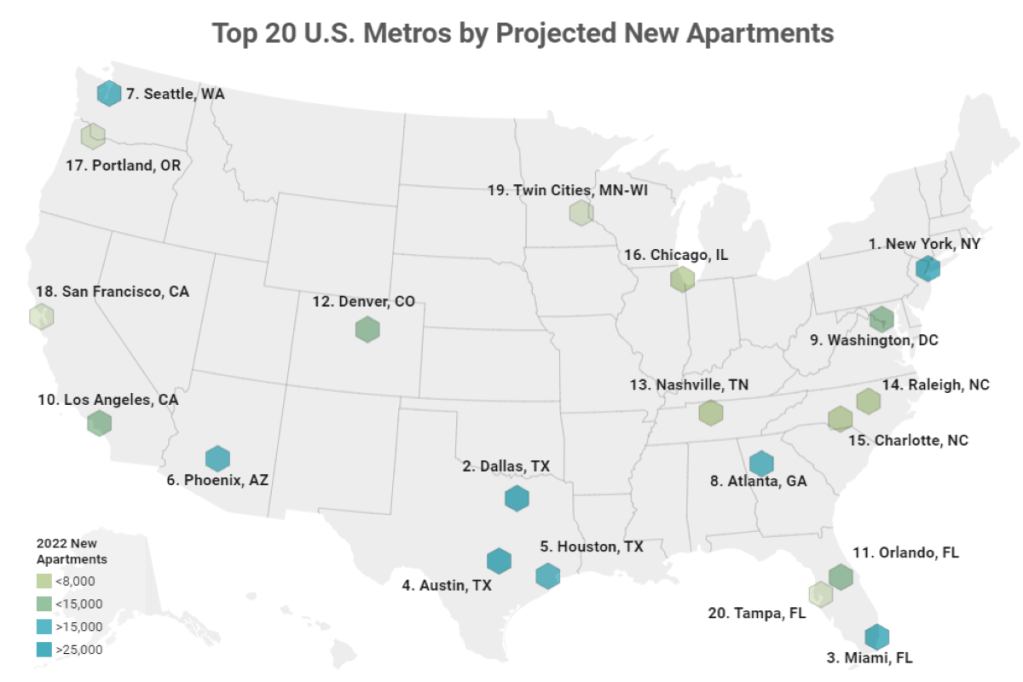 Continuing to break records, 10 of the top 20 metros are set to reach five-year building highs. The list includes New York; Miami; Austin; Phoenix; Seattle; Orlando, Florida; Nashville, Tennessee; Raleigh, North Carolina; Portland, Oregon; and Tampa, Florida.
