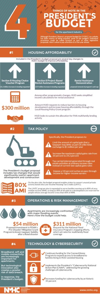 The president’s budget is traditionally used to lay out the administration’s priorities in the coming year. Although the president’s budget, as a whole, has little chance of being enacted, it’s possible several of its individual provisions could be enacted as part of other legislative proposals. For this reason, the National Multifamily Housing Council and the National Apartment Association are paying close attention to the budget details and process.