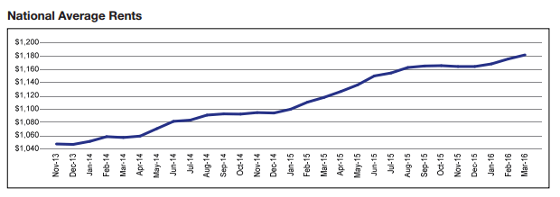 The national average rent price rose $6 in March, hitting another all-time high of $1,181 according to Yardi Matrix’s Monthly Rent Survey for March 2016.