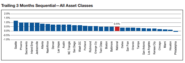 Seattle, Phoenix, Denver, and Atlanta all proved to be hot markets for rent growth in all asset classes on a three month basis—tracked over the first quarter of 2016—while Houston slowed noticeably and Philadelphia stood out as the only major market with a negative rent growth during the time period. Denver and Seattle continued their momentum from the past 12 months, with Seattle leading the pack and picking up by 1.2% in the first quarter and Denver rising 0.8% in March after a flat month in January. Phoenix and Atlanta both had upswings in rent growth, with Phoenix leaping to 1.0% from 0.2% the previous month and Atlanta rebounding from a negative -0.1% in February to 0.8% in March.