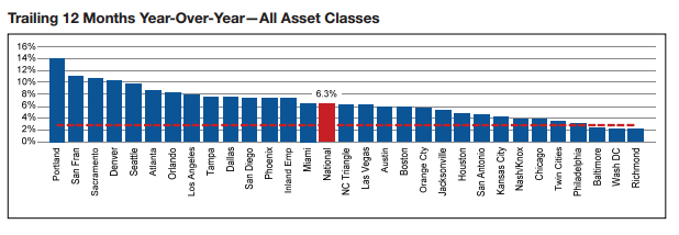 Over the last 12 months, national rents grew by 6.3% and Western markets led the rankings for rent growth with Portland seeing a higher than average rent increase of 14.1%. Oregon’s largest city was followed by San Francisco (11.0%), Sacramento (10.6%), Denver (10.3%), and Seattle (9.8%) among the top five markets. Portland, however, along with San Francisco, slowed in the first quarter of the year due in part to unsustainable growth.