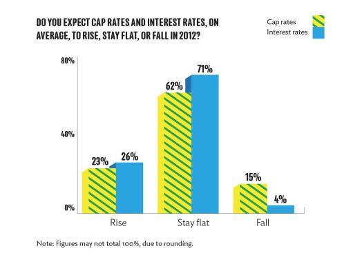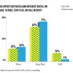 In an overwhelming majority, multifamily finance executives believe both cap rates and interest rates will remain flat or fall even lower next year. About 77 percent see cap rates either flattening or dropping farther next year, while 75 percent see the same for interest rates.