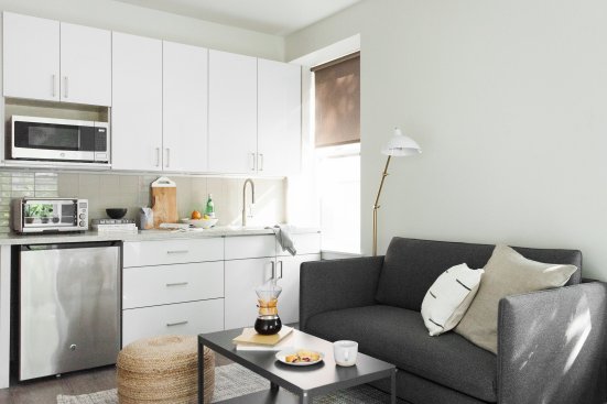 The homes in each building feature private studio-style rooms, each with their own bathroom and kitchenette, situated around furnished shared lounges and large, shared kitchens on each floor, which can be used as a place for residents to hang out, come together for events, and entertain. The spaces are more private than those in some of the existing Common properties, which typically are arranged as a few private-room and bath suites around a shared kitchen and living area within one unit.