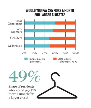 The choice between regular closets (4 feet by 6 feet) or large closets (10 feet by 6 feet) for an additional $75 drew the same response: Slightly more than half (51%) chose regular-sized closets, and 49% went for the larger closets. The large-closet percentage dropped to 45% with a $25 price increase to $100.