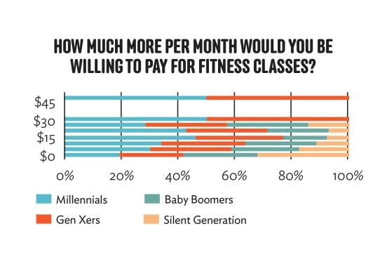 Offerings for which respondents would be willing to pay a minimum of $5 a month include fitness instruction, such as Zumba classes (46% of respondents); steam rooms (43%); track/walking trails (42%); and fitness machines with individually tailored connectivity and Bluetooth options (38%).