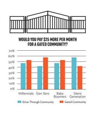 As observed in our 2015 Concept Community study, safety is a paramount concern for residents. Mirroring this, when asked to select between a drive-through community and a gated community for an additional $25, the majority (54%) of residents opted for a gated community. This number dropped to 49% when the price of a gated community was increased by $50 per month.