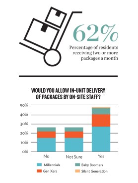 To streamline package delivery to units, 48% of residents gave their consent to in-unit delivery by on-site staff. Meanwhile, nearly one-third (31%) of respondents said theyâd be willing to pay a minimum fee of $5 per month for a 24/7 accessible package locker.