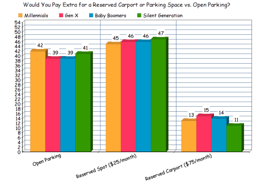 As you can see in the graph below, the majority of renters, 60%, indicate they would indeed pay more for a dedicated spot, versus a “drive-through” community. And it’s fair to suggest that at least 9% of those not willing to pay for a spot include, naturally, renters without a car.