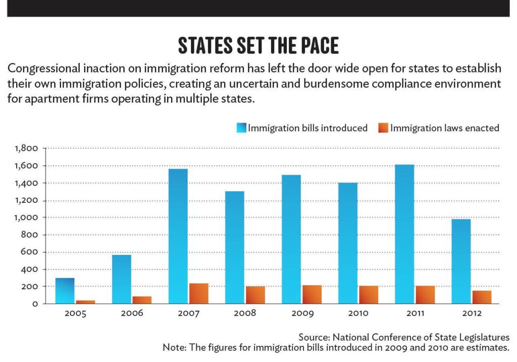 The multifamily industry is particularly concerned about laws that would hold apartment owners and operators responsible for the immigration status of apartment residents and impose employment-related mandates beyond federal requirements. Some state and local immigration laws have specifically targeted rental housing, including those enacted in Hazleton, Pa., and Farmers Branch, Texas. These laws have been challenged in court and put on hold but, if enforced, would hold apartment owners or management firms responsible for the legal status of their residents.