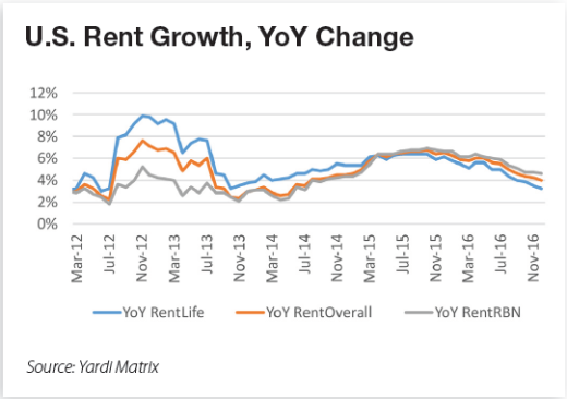 Yardi expects the rent-growth deceleration that began in the second half of 2016 to continue into 2017. This slowdown has its source in metros where supply and demand are mismatched, such as San Francisco, Denver, and Austin, Texas, where high demand and low supply led to severe rent deceleration after rates rose higher than tenants could afford.
