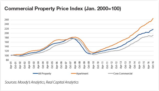 Investor interest in multifamily is currently high, with property values 50% higher than they were at their pre-crisis peaks and acquisition yields at 5.6% nationally in the third quarter of 2016, according to Real Capital Analytics. Concerns about whether the market has peaked have led to a slight slowdown in capital flow, but good market conditions have largely continued, fundamentals are strong, and property income seems stable.