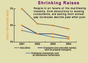 Slimmer Paychecks While multifamily employees are still getting raises in today’s concessionary market, those increases are getting smaller and smaller. From executives to housekeepers, pay raises are expected to slip again in 2005, continuing the trend of the past several years.