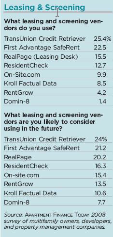 The clear winners in the leasing and screening category of this year’s survey are TransUnion Credit Retriever and First Advantage SafeRent, used by 25.4 percent and 22.5 percent of respondents, respectively. RealPage’s LeasingDesk product is also making strides. It is used by 15.5 percent of respondents and is being considered by more than 20 percent for a future purchase.