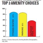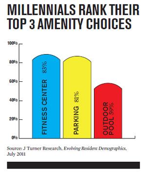 Gen Y residents make working out a priority, with 83 percent marking fitness centers as their No. 1 common-area amenity preference, according to J Turner Research’s 2011 Evolving Resident Demographics report.