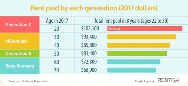 Based on the observation that total rent paid between the ages of 22 and 30 rises by about $5,000 to $8,000 each decade, Generation Z, those consumers currently ages 22 and under, could be paying $102,100 on rent between the ages of 22 and 30.