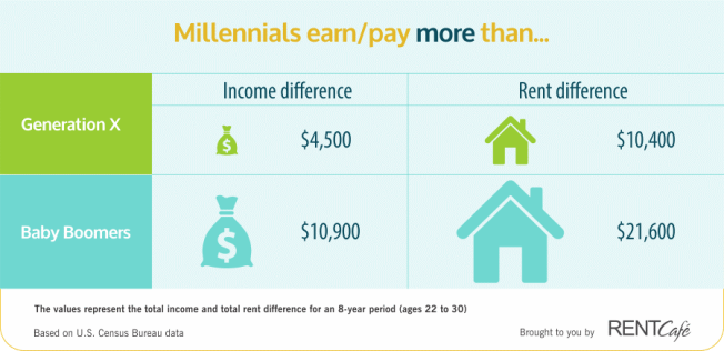 RENTCafé has examined the total income and total rent paid by baby boomers, Generation X, and millennials between ages 22 and 29, as recorded in the U.S. Census, in order to discover whether millennial renters are more cost-burdened than renters in previous generations. The study examines single renters paying the national median rent while earning the national median income over a given eight-year period, and all amounts are adjusted for inflation.
