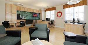 Laramar often makes such spaces true cafés by including coffee machines and snacks, couches and pub tables, and positioning the room to overlook a pool or common area. The company also puts televisions in its Internet cafés, sometimes building a “television mosaic,” composed of one large TV with three smaller TVs on top of it. The larger TV is the focal point, with the smaller ones running sports or cable news channels with bottom-line tickers, like CNN or ESPNews.