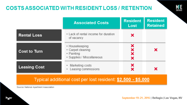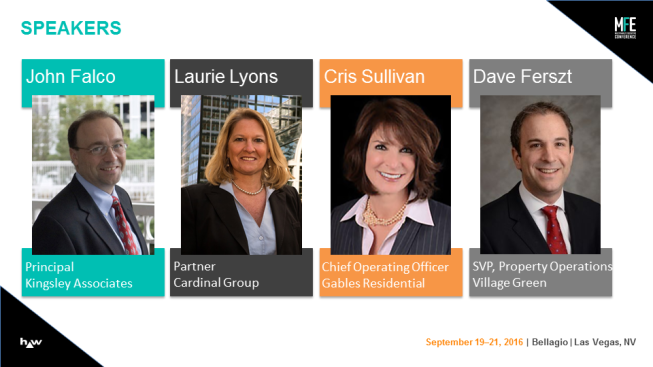 At the MFE Conference in Las Vegas last month, Falco and other experts discussed various ways to keep tenants from leaving. Dave Ferszt of Village Green Management Co., Laurie Lyons of Cardinal Partners, and Cris Sullivan of Gables Residential shared the ways they’re trying to keep residents in their communities longer. They all agreed the key is creating a sense of place and community.
