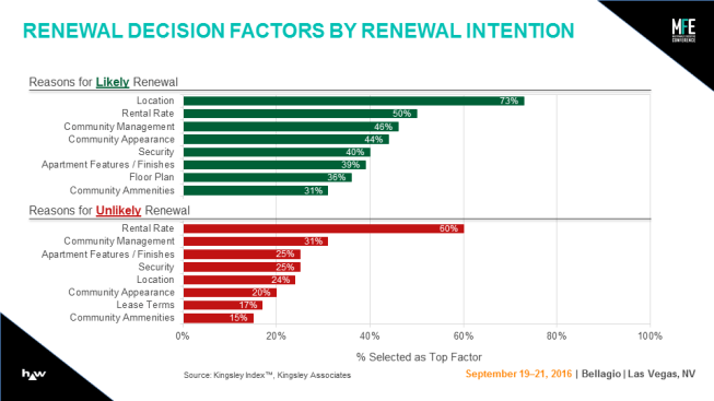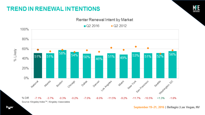 Renewals are one of the easiest ways multifamily owners and operators can ensure continued business success, but retaining tenants isn’t always that simple. Over the past several quarters, renters’ renewal intentions have continued to drop. In Q2 2016, only 51.4% of residents who were three to four months out from the end of their lease intended to renew.