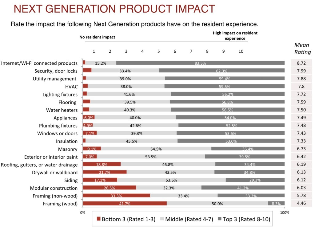 Next-gen building and construction products, in contrast, scored very low among survey participants, who said such products have a relatively low or no impact on the resident experience. Specifically, respondents cited framing, both wood and nonwood, as having the least impact, followed by modular construction and drywall.