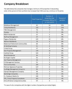 The second property to register the highest increase in ORA score is The Oasis, managed by The Ardizzone Group, in Indianapolis. The Oasis upped its ORA score by 46 points to 86 in July.