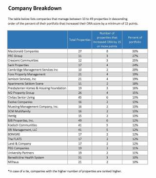 The No. 1 property with the highest stride in ORA score is The Marlowe Lake Boone Apartments, managed by Greystar, in Raleigh, North Carolina. The property, with a current ORA score of 90, improved by 49 points since January.