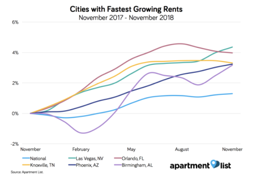 According to the report, Las Vegas has experienced the nation’s fastest rent growth, with a 4.4% increase from November 2017 to November 2018. Orlando, Fla., takes second place, with a 4% YOY growth rate, and Knoxville, Tenn., comes in third, at 3.3%. Other cities with the fastest-growing rents include Phoenix and Birmingham, Ala.