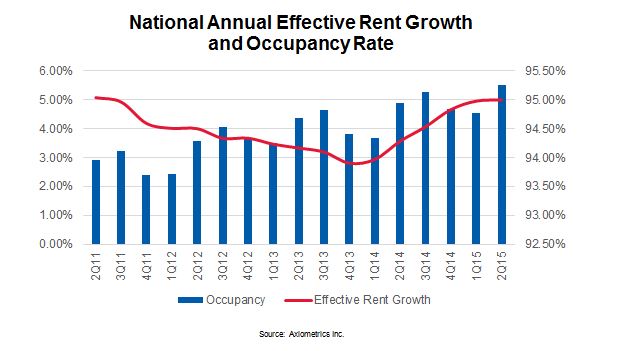 • Annual effective rent growth rate of 5.0% represented a 4-basis-point (bps) increase from the 4.9% reported in 1Q15 and a 142-bps rise from the 3.6% in 2Q14. The figure is the highest since 2Q11, when rent growth was 5.1%.