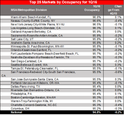 Occupancy remained strong, at 94.8%, in the first quarter, tied for the highest first-quarter rate since 95.7% at the start of 2001, according to Axiometrics. This year’s first-quarter rate was essentially the same as last year’s but 16 basis points lower than the 94.8% in 2015’s fourth quarter.