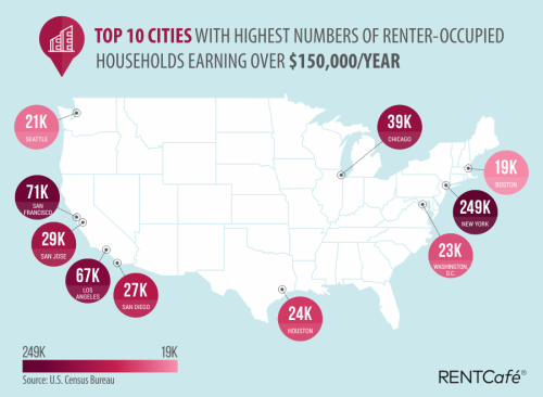 Top earners, or Americans making $150,000 or more per year, are the fastest-growing renter segment, according to apartment search website RENTCafé. After analyzing recent U.S. Census data, the research team at the company found that more than 1.35 million high-income households became renters between 2007 and 2017, a 175% increase.