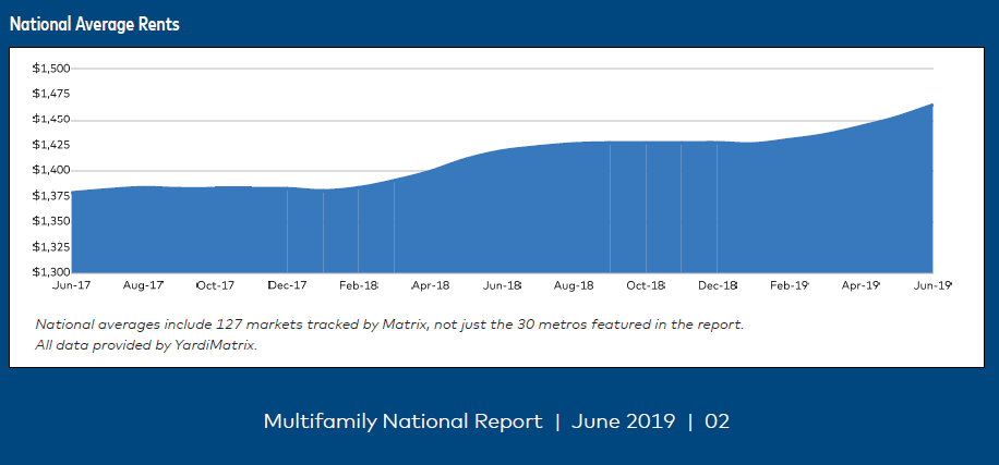 Following some months of moderate rent growth, the average U.S. multifamily rent rose by $12 in June 2019 to $1,465, according to the latest Matrix Monthly report by Yardi Matrix. At the same time, year-over-year rent growth rose to 3.2%, up by 40 basis points from May’s seasonally adjusted 2.9% year-over-year rent growth.