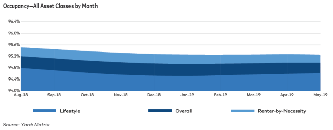 Rents have risen 2% so far in the second quarter, and 2.6% overall this year. The number of renter households rose to an all-time high in the first quarter of 2019, rising by more than 600,000 to 43.8 million, and Yardi does not anticipate demand for multifamily will slow any time soon.