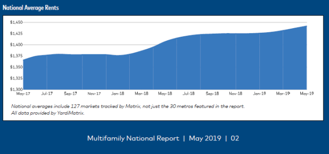 U.S. multifamily rents rose by $5 to $1,442 in May 2019, marking a $14 rise over the last three months, according to the latest Matrix Monthly report by Yardi Matrix. At the same time, year-over-year rent growth fell by 50 basis points, down to 2.5% for May.