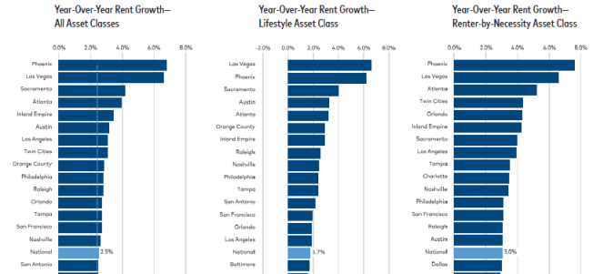 Seattle leads the nation with 0.6% rent growth on a T-3 basis, while Nashville, Portland, Ore., Phoenix, and Las Vegas come in second at 0.5%. Yardi notes that Phoenix and Las Vegas have seen strong rent growth for several years, but other markets have moved up and down the rent growth tables over time. Seattle (0.8% YOY), Nashville (2.6% YOY), and Portland (1.2% YOY) all have strong growth fundamentals and heavy supply pipelines, which influence an inconsistent rate of rent growth.