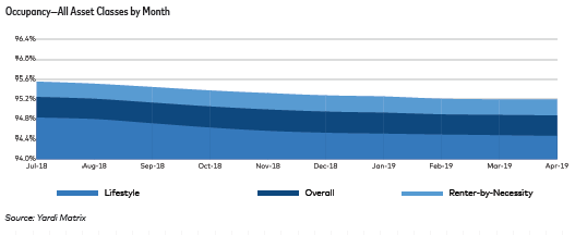 Occupancy levels of stabilized properties have fallen by 30 basis points, down to 94.9% year over year through April. (Occupancy rates are current as of the previous month.) Yardi notes that supply growth has affected occupancy in some markets, including Houston, where the occupancy rate fell more than 100 basis points to 92.4% in April.