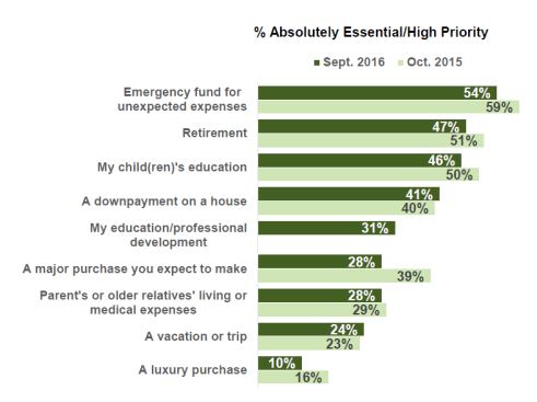 - Millennials: Emergencies (61%), children’s education (52%), retirement (48%), professional development (45%), and a home down payment (40%);
