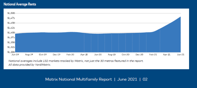 The national average multifamily rent rose by $23 in June, up to $1,482—shattering growth records for Yardi Matrix’s Multifamily National Report. Year-over-year rent growth also rose to the highest level in the history of the dataset, up 6.3% in June.
