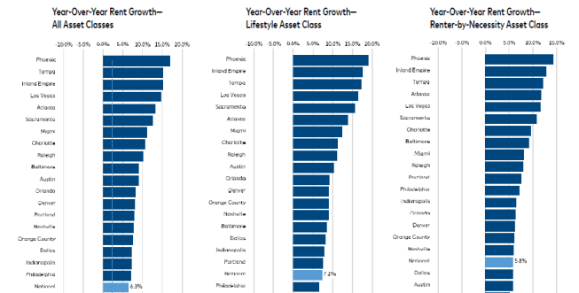 Out of the top 30 markets, 27 experienced positive rent growth on a year-over-year basis, with nine racing into double-digit growth. Phoenix topped the list at 17%, followed by Tampa, Florida, and California’s Inland Empire, both at 15.1%. (San Francisco, New York, and San Jose, California, are the only top 30 markets where rent growth remains negative.) Broken down by product category, luxury Lifestyle rents rose by 7.2% YOY—outpacing Renter-by-Necessity rents (5.8%) for the first time since 2011.