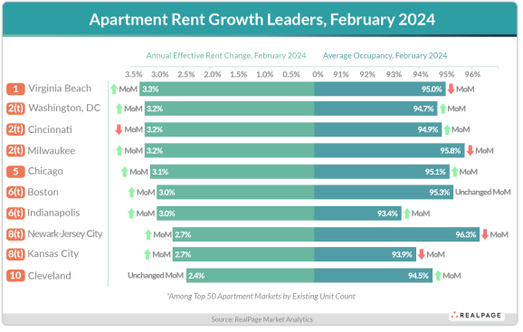 Virginia Beach, Virginia; Washington, D.C.; Cincinnati; and Milwaukee, which are relatively low-supply markets, topped the list for annual rent growth last month.
