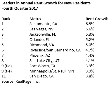 Two years ago, more than a dozen big metros registered rent jumps topping 6%, with the pace of increase reaching as high as 12% in Portland, Ore., then the country’s rent-growth leader. Rents in Portland climbed just 1.9% in 2017.
