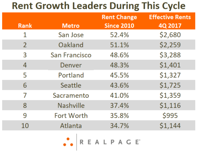 On an individual basis, markets on the West Coast have led the way in terms of rent growth, including six of the top 10 leaders since 2010.
