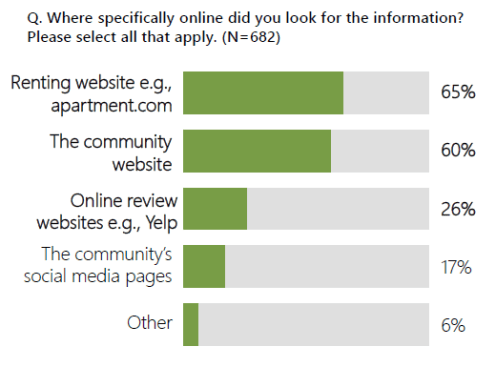 Nearly 70% of renters research communities online at some point during the search process, according to the index. While the majority of searches are done prior to their visit to the communities, nearly 20% of renters conduct research when they are in the communities. Predictably, renting websites are the most common source where renters find information (65%), closely followed by community websites (60%).